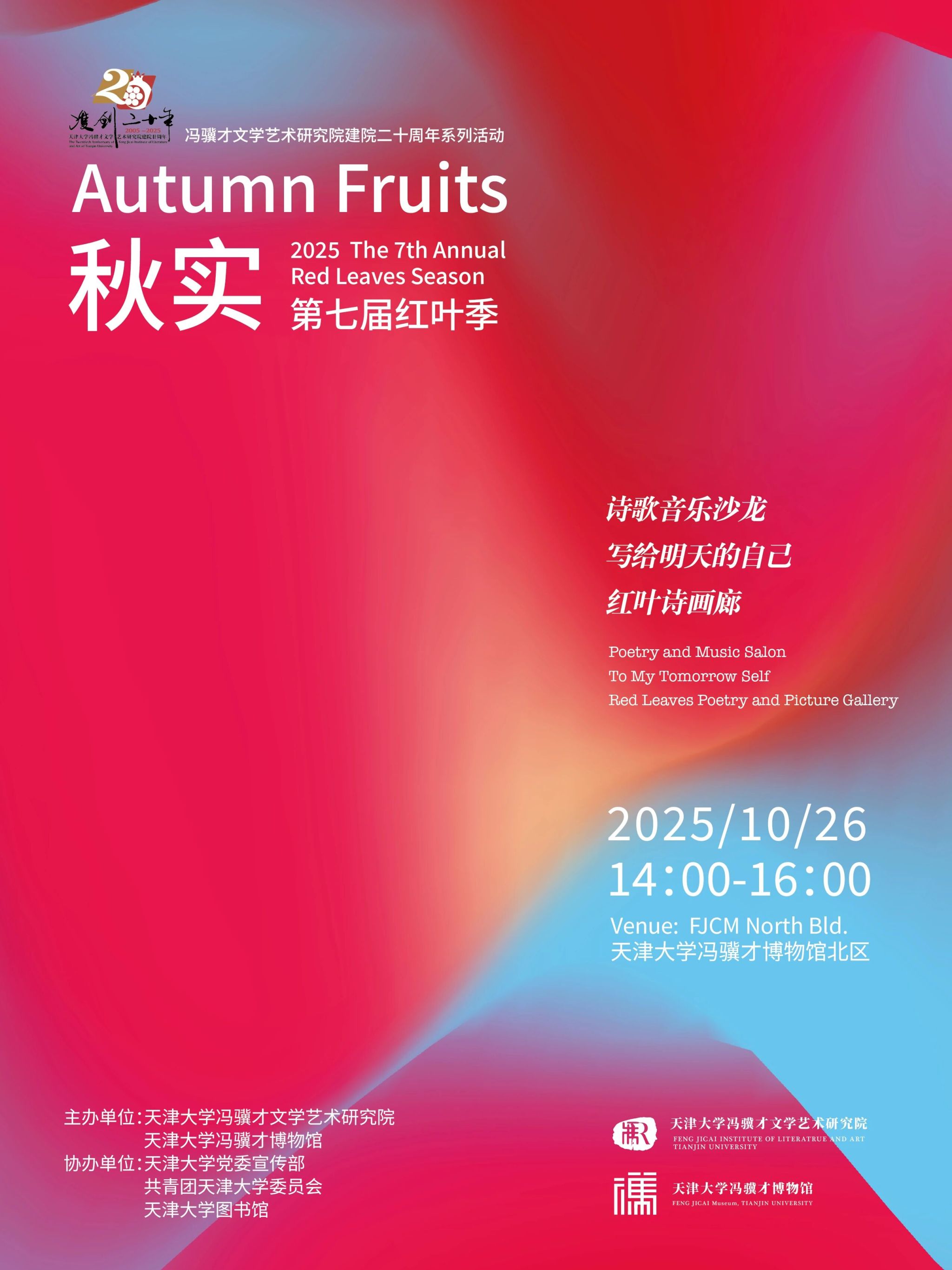 百卅芳华的天津大学,结出无数丰收的硕果;建院20年的冯骥才文学艺术研究院,也增添了“冯骥才博物馆”这沉甸甸的果实。2025第七届红叶季,以“秋实”为主题,将于10月26日下午,在冯骥才博物馆北区举办线下活动。