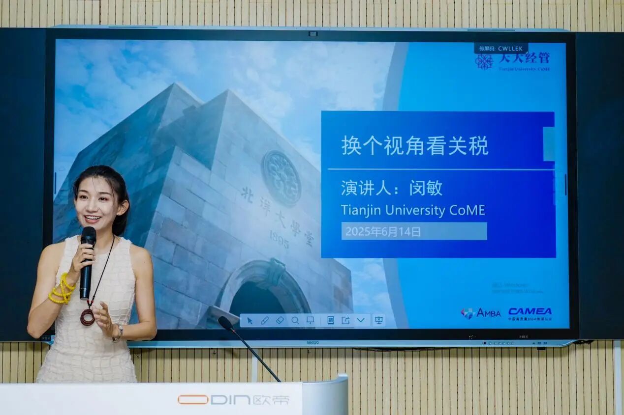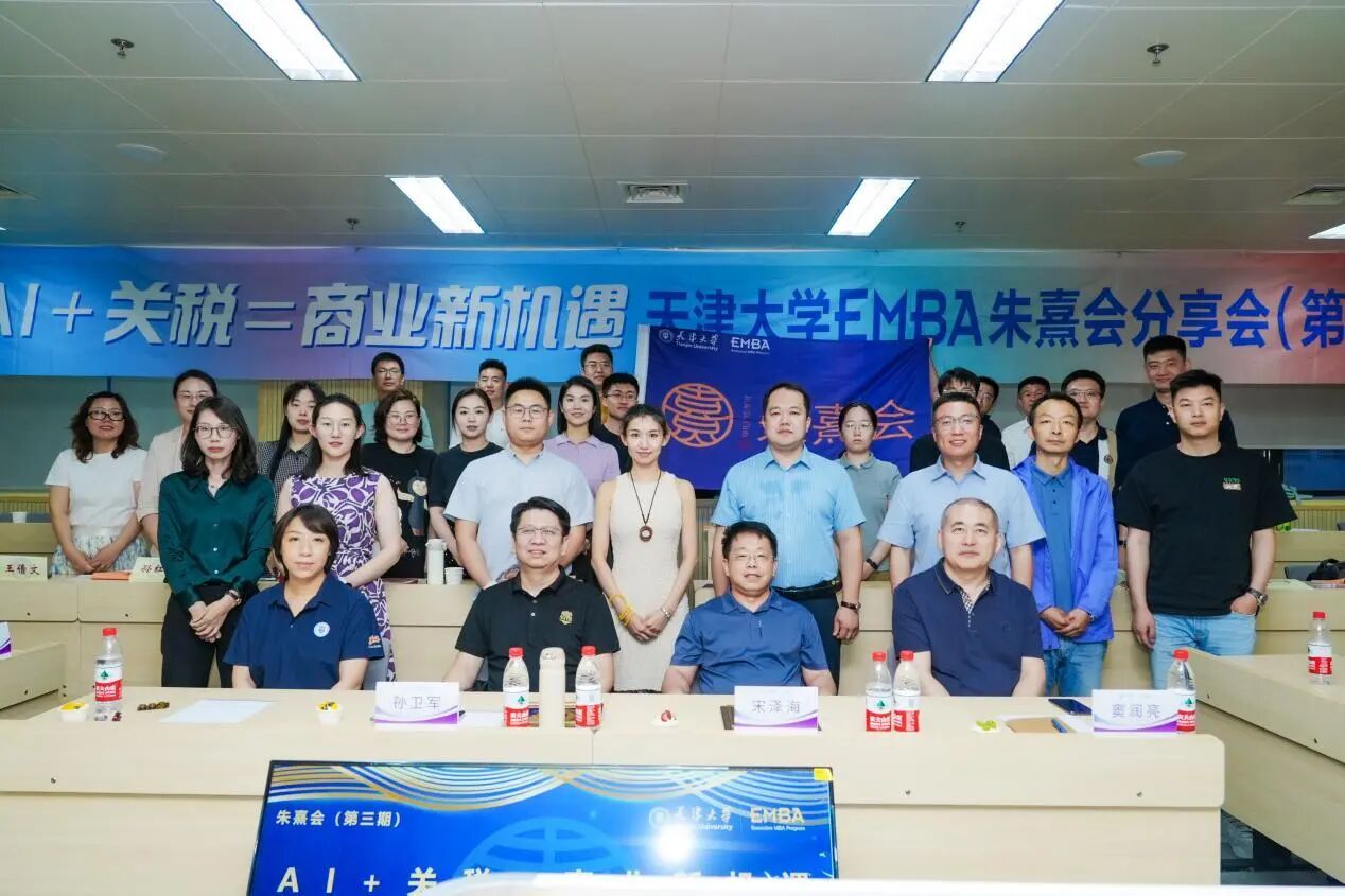 6月14日,天津大学EMBA朱熹会 “AI+关税=商业新机遇” 主题分享会在天津大学顺利举行。天津国资研究院副院长宋泽海,天津市优秀创新创业导师、天津大学宣怀学院副院长孙卫军,2022级EMBA校友、EMBA校友会朱熹会会长、天津泰毅海科技有限公司总经理史俊,天津大学管理与经济学部副主任郑春东,学部EMBA项目主任窦润亮出席活动,学部EMBA、MBA、MEM等专业的在校生与校友共同参与。本次活动围绕人工智能、关税政策、AIGC等前沿议题展开深入探讨,共同解构技术变革与国际贸易政策的融合路径,为企业数字化转型与商业创新提供理论支持与实践启示。分享会由2024级EMBA程鹏主持。