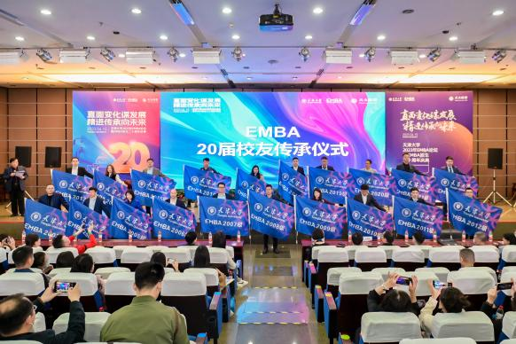 今年正值天津大学EMBA项目招生20周年,为使天大EMBA精神薪火相传,会上成立了天津大学EMBA校友会理事会,并特别策划举行了EMBA20届校友传承仪式。每一届EMBA的校友代表举起一面旗帜,二十面旗帜既象征着天津大学EMBA项目培养人才、不断精进的20年,也象征着EMBA校友们携手奋斗过的20年。在未来,天大EMBA的队伍会不断发展壮大,EMBA的优良传统和奋斗精神将生生不息。