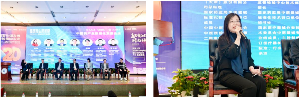 “中医药产业数智化发展论坛”由慧医谷中医药科技(天津)股份有限公司总经理李慧主持,天津中医药大学原副校长孟昭鹏,天津市医疗器械质量监督检验中心技术部部长、国家药监局中医器械标准化技术归口单位秘书长李立宾,天津市医疗器械审评查验中心质量管理部副部长崔涛,河北工业大学人工智能与数据科学学院研究员、河北省数据驱动工业智能工程研究中心主任刘晶,尚药堂大健康产业集团有限公司总经理张光达,云华堂(天津)中医药科技有限公司首席科学家合伙人汤善江共同参加。