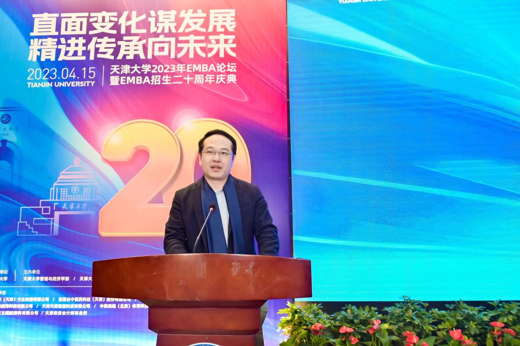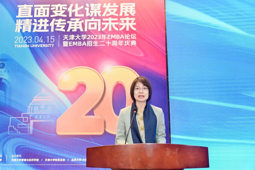 天津大学党委副书记雷鸣对本次活动的举办表示热烈的祝贺。她回顾了天津大学的悠久历史,并指出,近些年来天津大学深刻理解把握国家和时代对高等教育的新部署、新要求,在强国建设、民族复兴中找准定位,积极推进教育、科技、人才协同发展,在人才培养、学科建设、科技自立自强等方面取得了显著成效。她特别提到,今年是刘豹先生诞辰100周年,刘先生作为民族创新的脊梁,要认真学习先生直面世界变化精进传承、引领创新的精神。雷鸣表示,天津大学EMBA项目作为学校培养高级管理者的重要平台,开办20年以来已有2000余名优秀校友在这里学习、成长,特别是今天看到同学们、校友们从四面八方奔跑而来、蓬勃向上的场面,非常高兴。希望大家能借助论坛的机会相互交流,激发思考,为全面建设社会主义现代化国家、全面推进中华民族伟大复兴贡献力量。