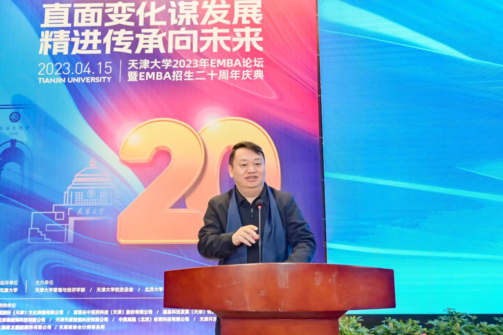 天津大学EMBA校友会常务副会长、天津广益灵健康科技有限公司董事长童元明代表EMBA校友会向2023年EMBA发展论坛暨EMBA招生二十周年庆典的成功举办表示热烈的祝贺。他讲到,2010年在天津大学管理与经济学部攻读EMBA的过程中,既丰富了知识结构,又结识了很多实干的、高素质的企业家,使自己对企业经营管理有了更深刻的了解。同时他提出要建立社会责任感,“不仅要做一个成功的人,更要做一个有价值的人”,倡导大家一起投身公益,在公益活动中形成一种价值共识,发掘共同目标,共享资源,成为发展共同体,实现共赢。他建议大家关注中医中药,采用科学的生活方式,拥抱健康。