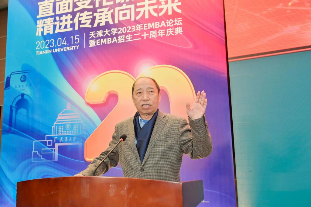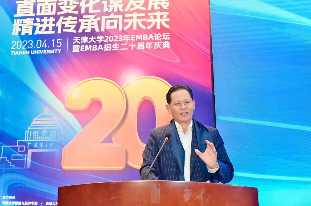 天津联商创新发展促进会会长、津兰集团董事长郭宝印代表联商发展促进会对天津大学2023年EMBA发展论坛暨EMBA招生二十周年庆典的召开表示热烈的祝贺。他表示天津大学自从创办之日起就被种下合作与创新的基因,创业实干,兴学强国的精神在天大人中代代相传。天津大学EMBA项目2002年招生至今,依托经管学部的学科优势和强大师资力量向社会源源不断的输送具有突破性创新思维、强大执行力、全球化视野和负责任的知识型人才。他们在各个行业中成就斐然,不仅具有家国情怀,更是将行动落到实处,无处不展现着“天大人”的风采。